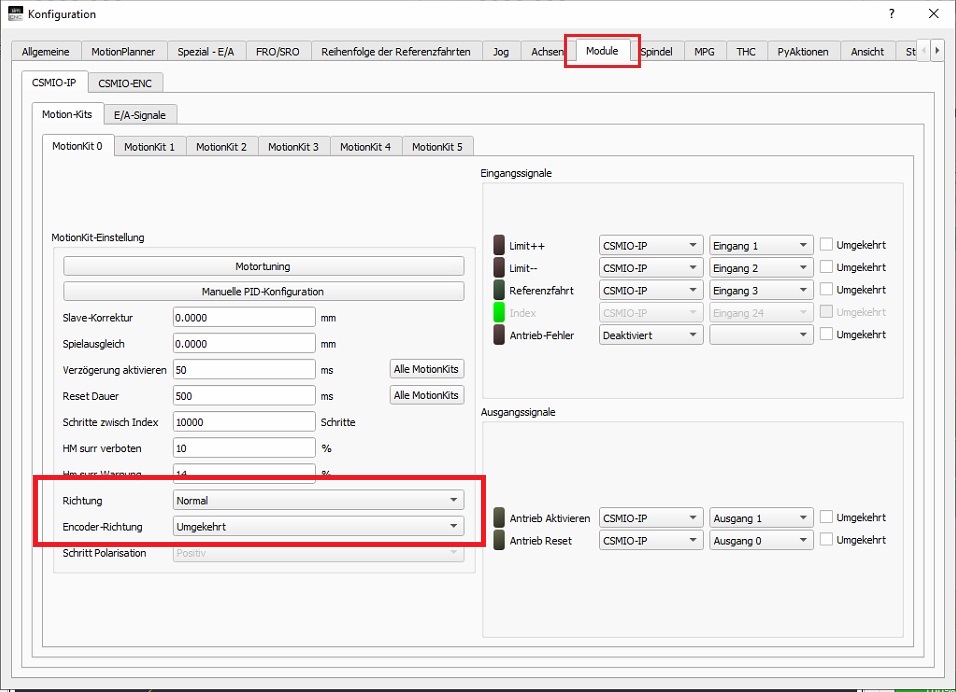 Suchen Sie unten links die Einstellungen "Encoder-Richtung" und wechseln Sie auf "Umgekehrt"