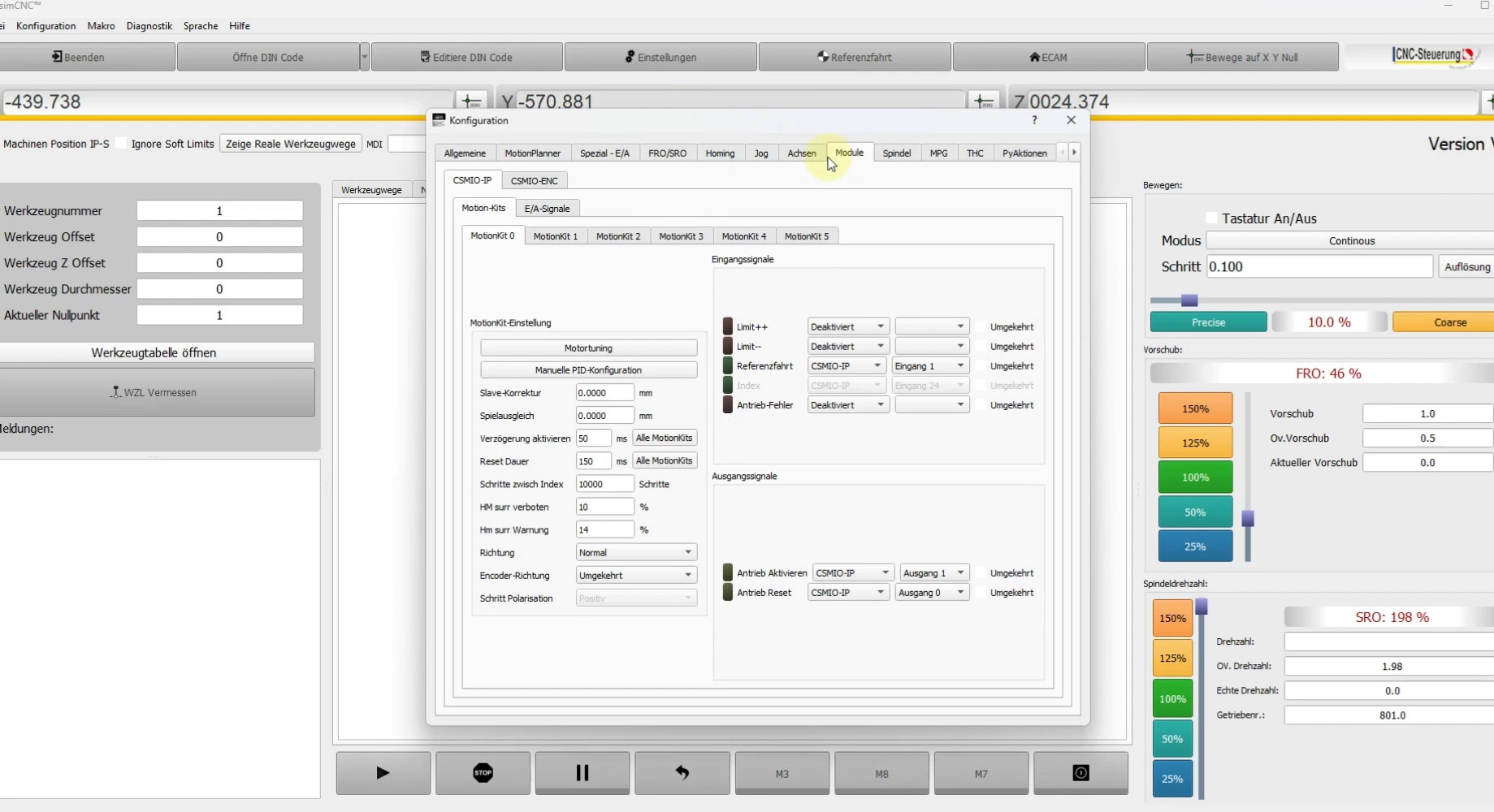 Gehen Sie in Moduls bei der jeweiligen Achse auf "Manuelle PID Konfiguration" und stellen Sie alle Werte auf 0, stellen Sie die Fehlertolleranzen auf 10.000 ein.