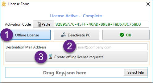 3. Innerhalb von 24 Stunden erhalten Sie an die angegebene E-Mail-Adresse die Lizenzdatei mit dem Namen Key.Json. Legen Sie die Schlüsseldatei in diesen Ordner: C:\Users\<Benutzername>\Documents\ECAM V5\Data Oder klicken Sie im Lizenzdialog auf [Offline-Lizenz] und ziehen Sie die Datei per Drag & Drop in den Bereich "Key.Json hierher ziehen". Alternativ können Sie die Aktion [Datei auswählen] verwenden, um die Datei Key.Json zu importieren.