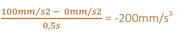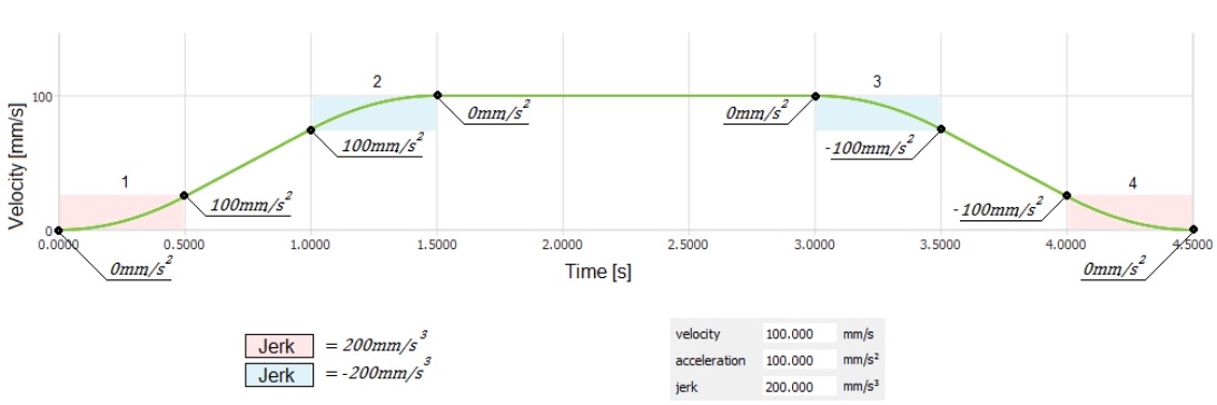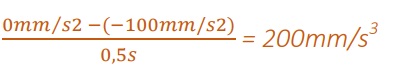 Wie bereits jetzt ersichtlich ist, erreicht die Achse an den rot markierten Stellen der Kurve einen Spurt von 200 mm/s3 und an jenen, die blau markiert sind, einen von -200mm/s3