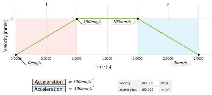 Erster Teil der Kurve – die Achse steigert ihre Geschwindigkeit innerhalb von 0,5 Sekunden von 0 mm/s bis 100 mm/s. Dies bedeutet, dass die Achse einen Spurt von 200 mm/s2 erreicht hat.