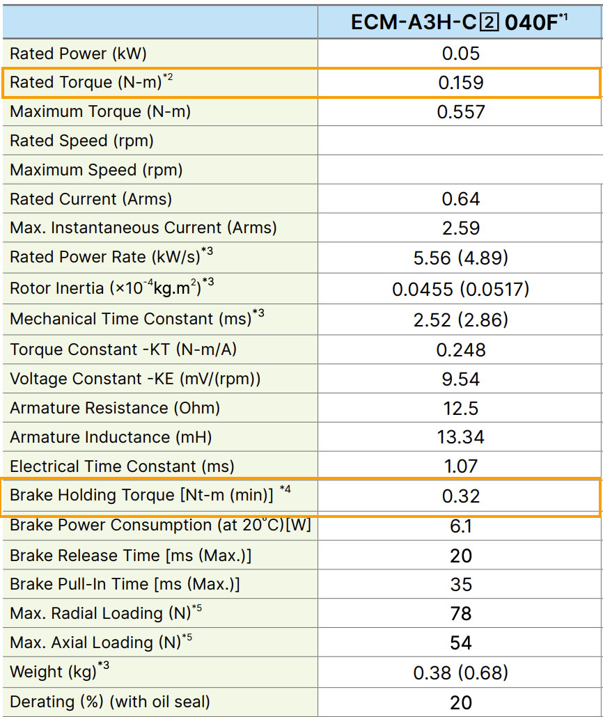Am Datenblatt eines 400 Watt Motors sieht man sehr gut das der Motor nominal 0,15 Nm hat. Die Bremse hat eine Haltekraft von 0,3 Nm.