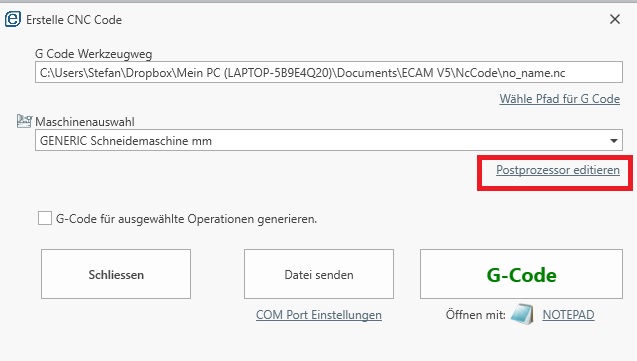 Um den aktuellen Postprozessor zu bearbeiten, klicken Sie im Codegenerierungsdialog oder im Setup-Bildschirm auf [Werkzeugmaschine bearbeiten] .