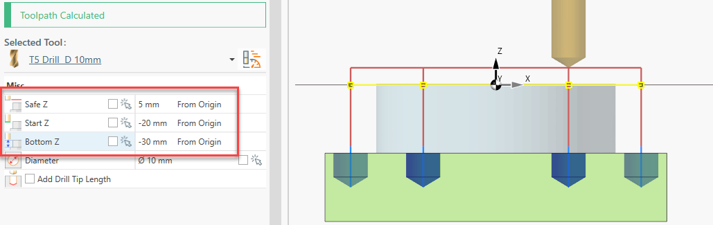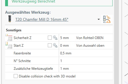 Zusätzliche Werkzeugtiefe: Diese Eigenschaft ermöglicht es, das Werkzeug in Z-Richtung nach unten zu bewegen, aber die gleiche Fasentiefe beizubehalten.