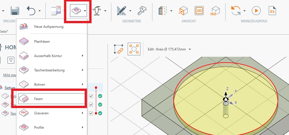 Ebenso steht Ihnen die Möglichkeit des Fasen bereit, aktivieren Sie dieses wenn Sie den Rohteil eine Fase verpassen möchten.