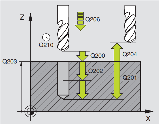 Q204: Es ist die inkrementale Koordinate SAFE Z LEVEL von Q203. Es ist die sichere z-Ebene, wo das Werkzeug mit nichts kollidiert.