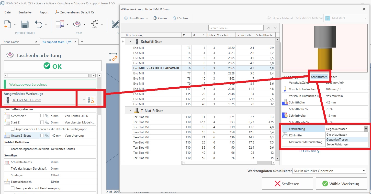 Klicken Sie Schnittdaten, Wählen Sie bei Fräsrichtung die gewünschte Richtung aus.