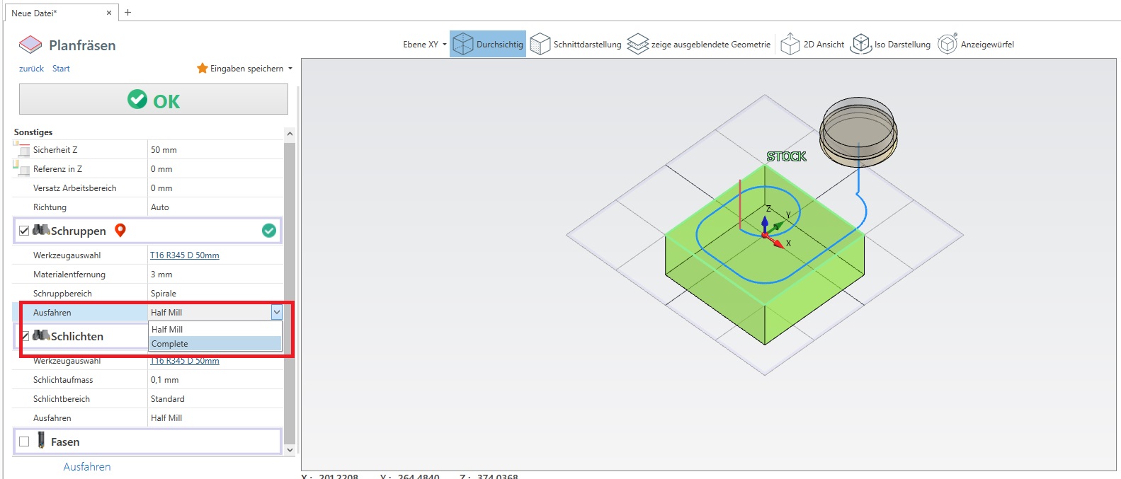 Ausfahren: Klicken Sie auf "Half Mill" um die Optionen angezeigt zu bekommen. Es stehen Ihnen - Halbes Werkzeug und ganzes Werkzeug zu Verfügung.