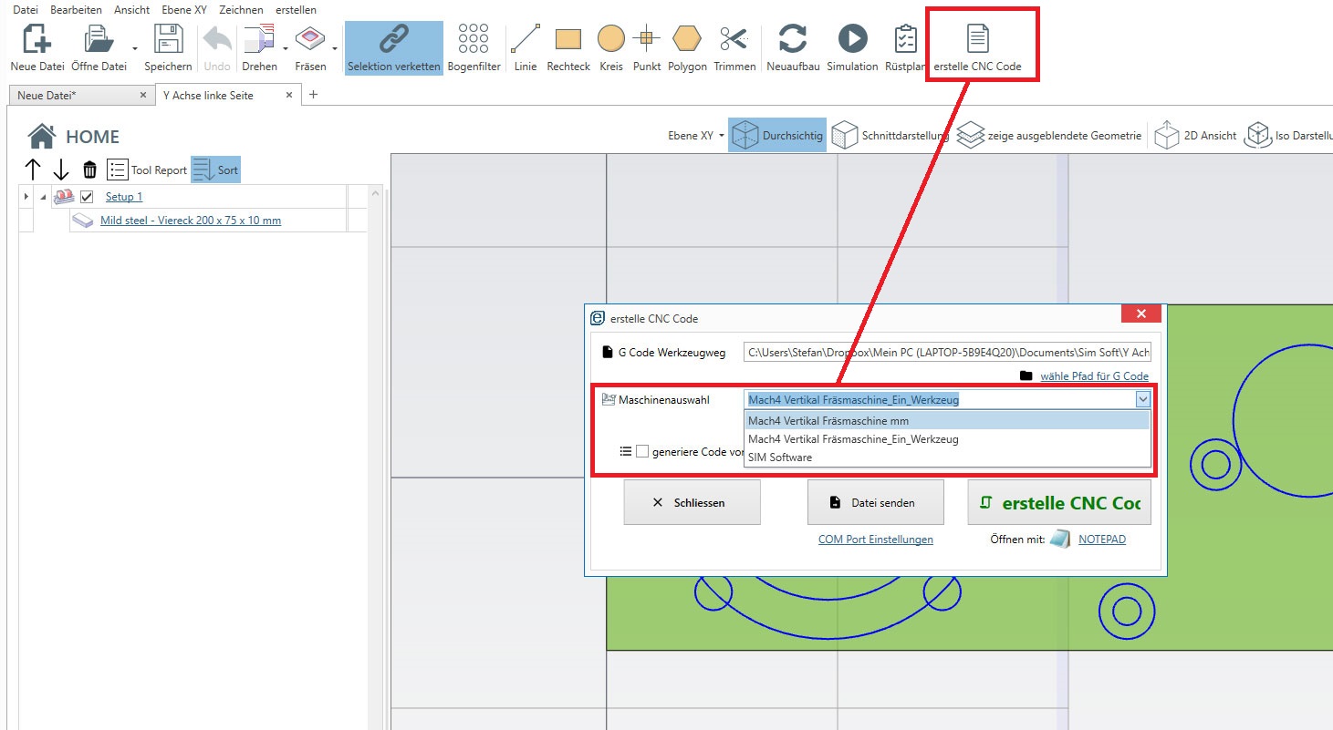 Wenn Sie dann die ECAM erneut starten, erstellen Sie ein Bauteil - wählen Sie "Erstelle CNC Code" und gehen Sie dann auf Maschinenauswahl.