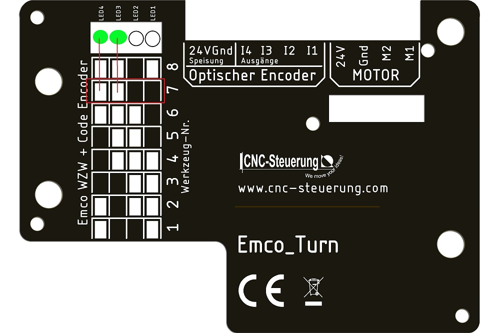 Hier im Beispiel leuchten die LED 4 und LED 3 , gemäß der Zuordnung muss nun Werkzeug 7 eingelegt worden sein.