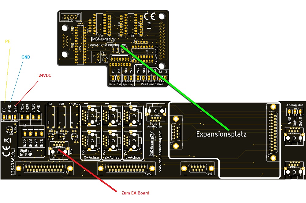 Legen Sie die 24 Volt Spannungsversorgung an Big IO Board an den gekennzeichneten Stellen an.