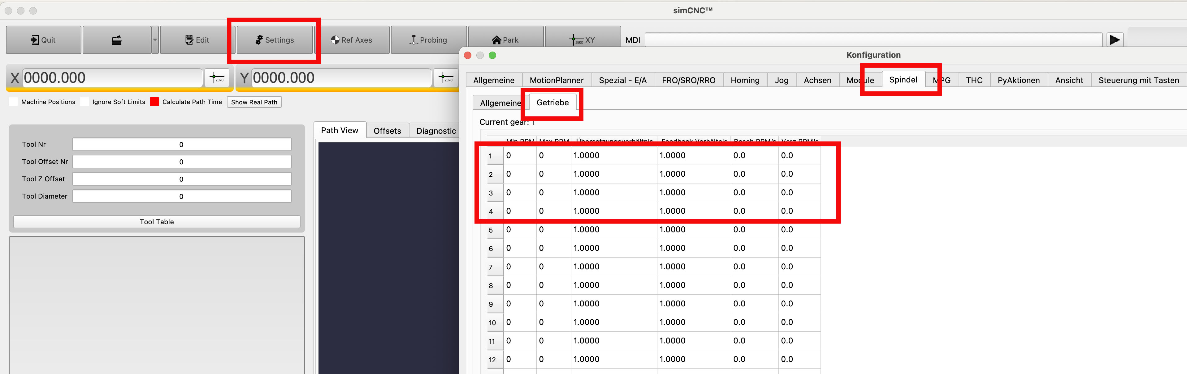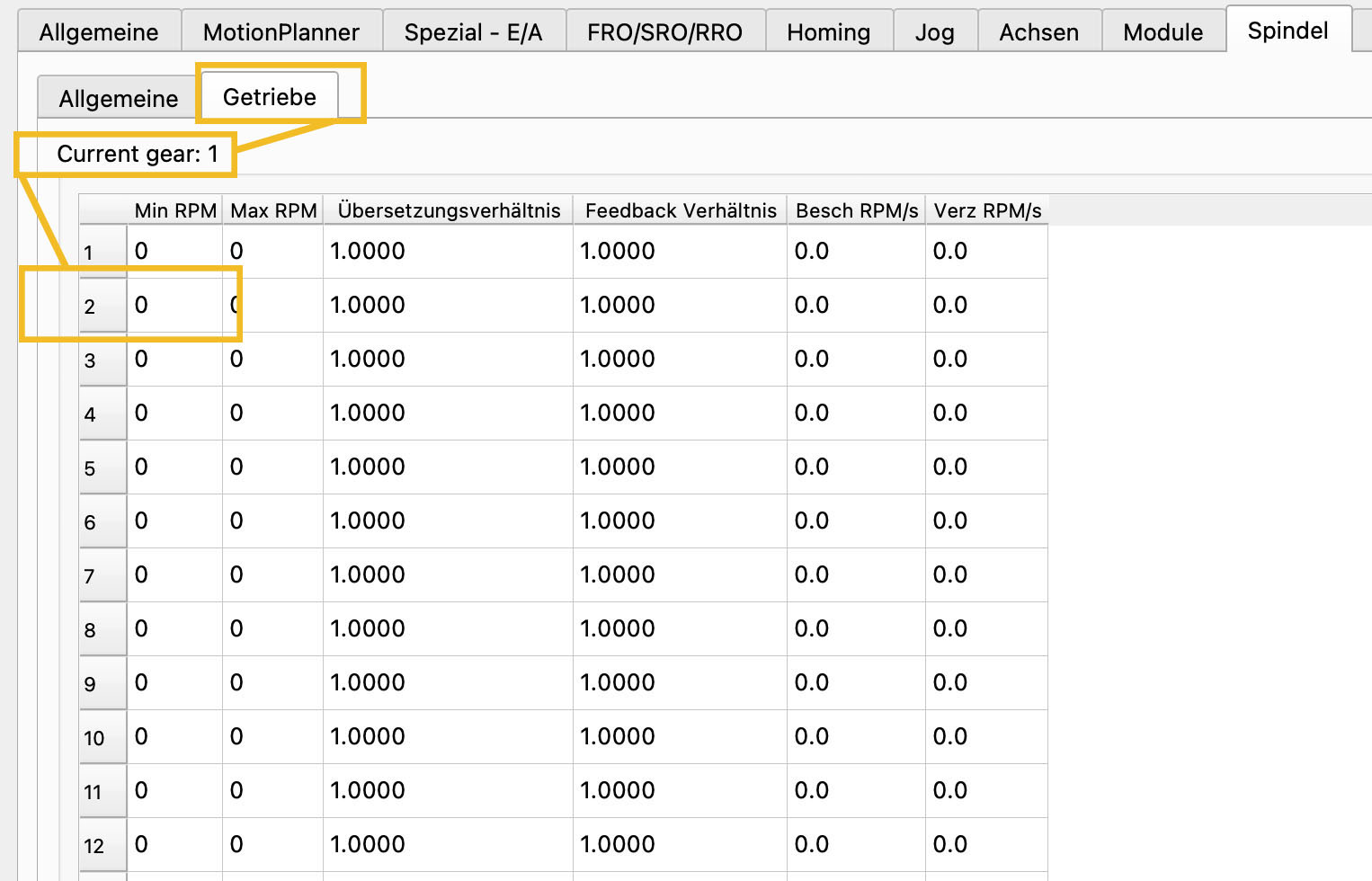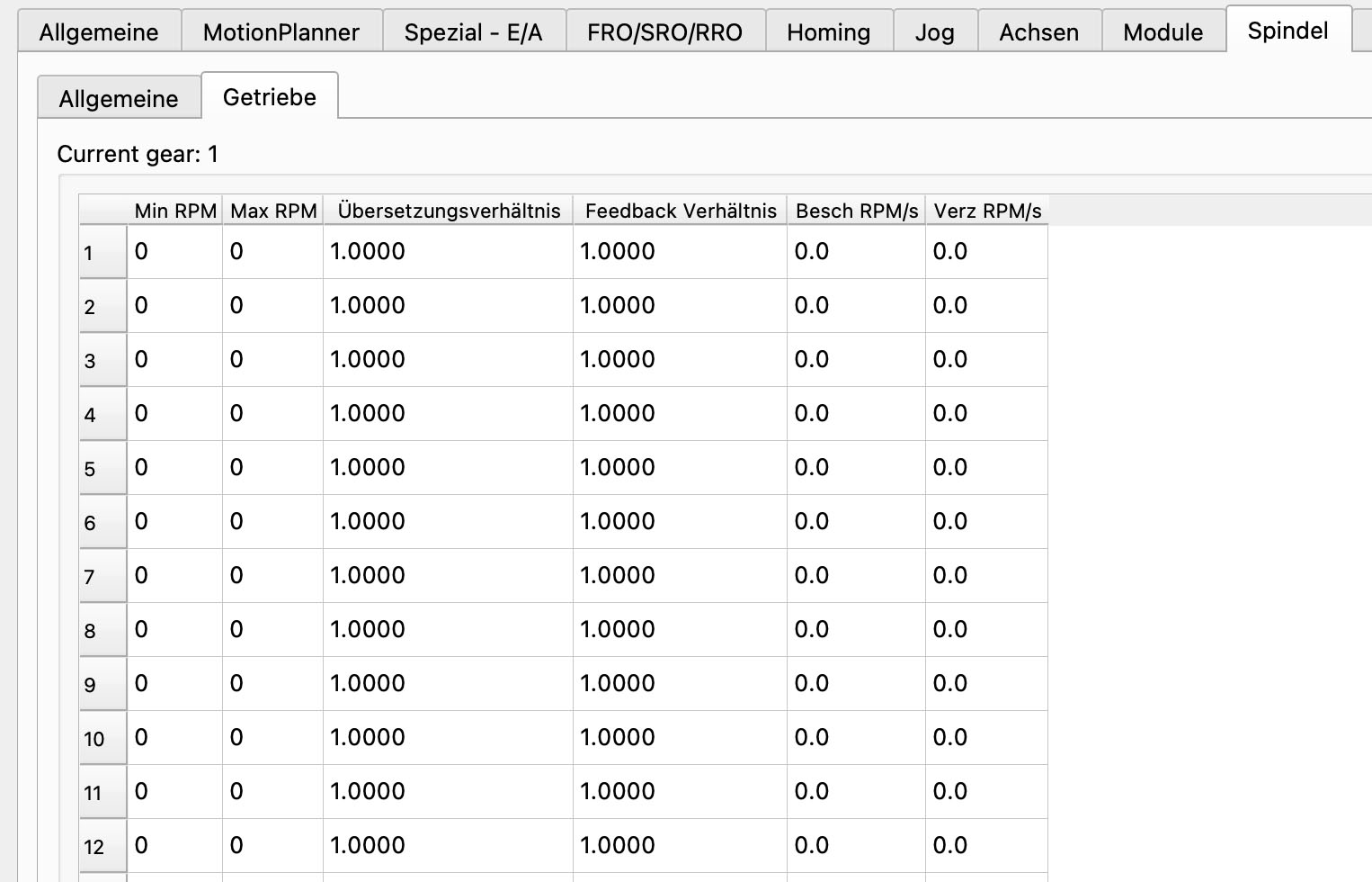 Öffnen Sie die Konfiguration-gehen Sie auf Spindel und dann auf den Reiter Getriebe.