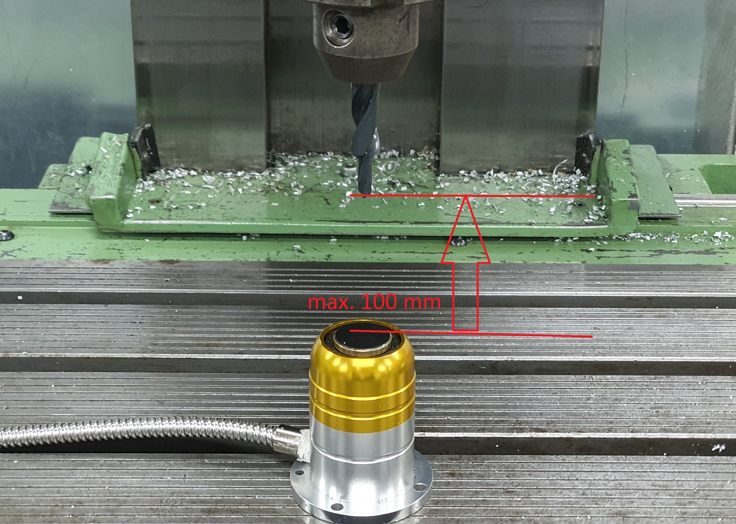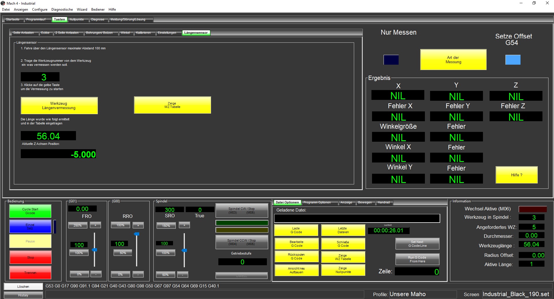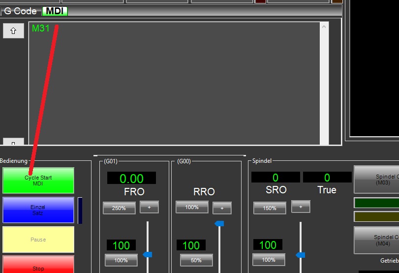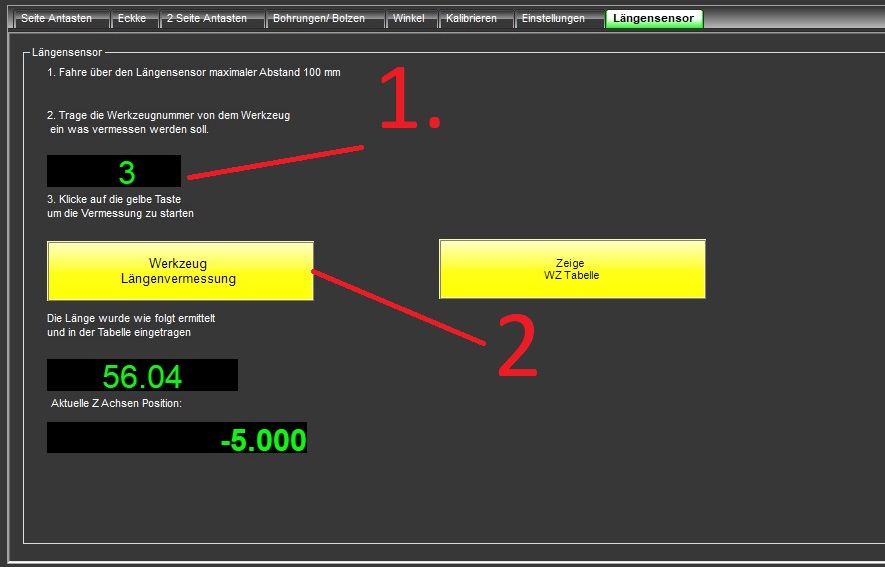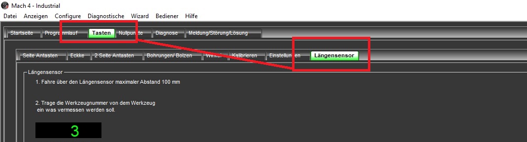 Fahren Sie den Längentaster unter das Werkzeug - Abstand max. 100 mm. Wer weiter als 100 mm entfernt startet erhält eine Fehlermeldung das der Taster nicht angefahren werden konnte.