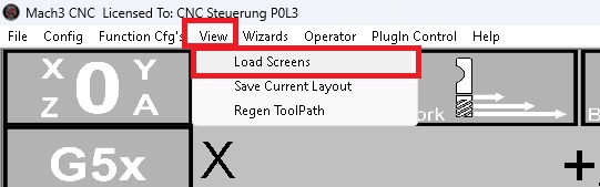 Um nun die Oberfläche zu laden, starten Sie die Mach3 Software mit Ihrem Profil - gehen Sie auf View - Load Screens