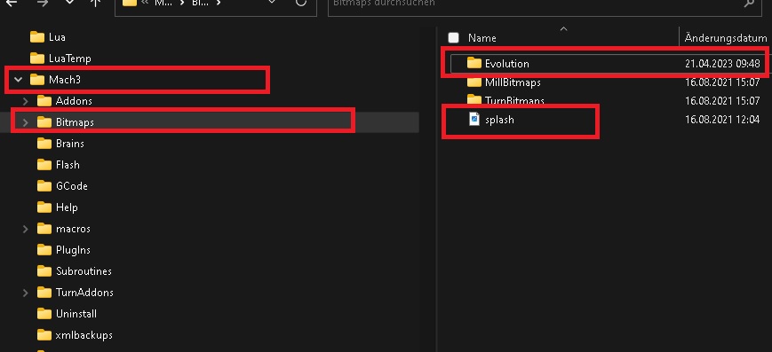 - Entpacken Sie die Datei. Sie werden einen Ordner Evolution sehen. Kopieren Sie diesen in den Ordner Bitmaps der Mach3.