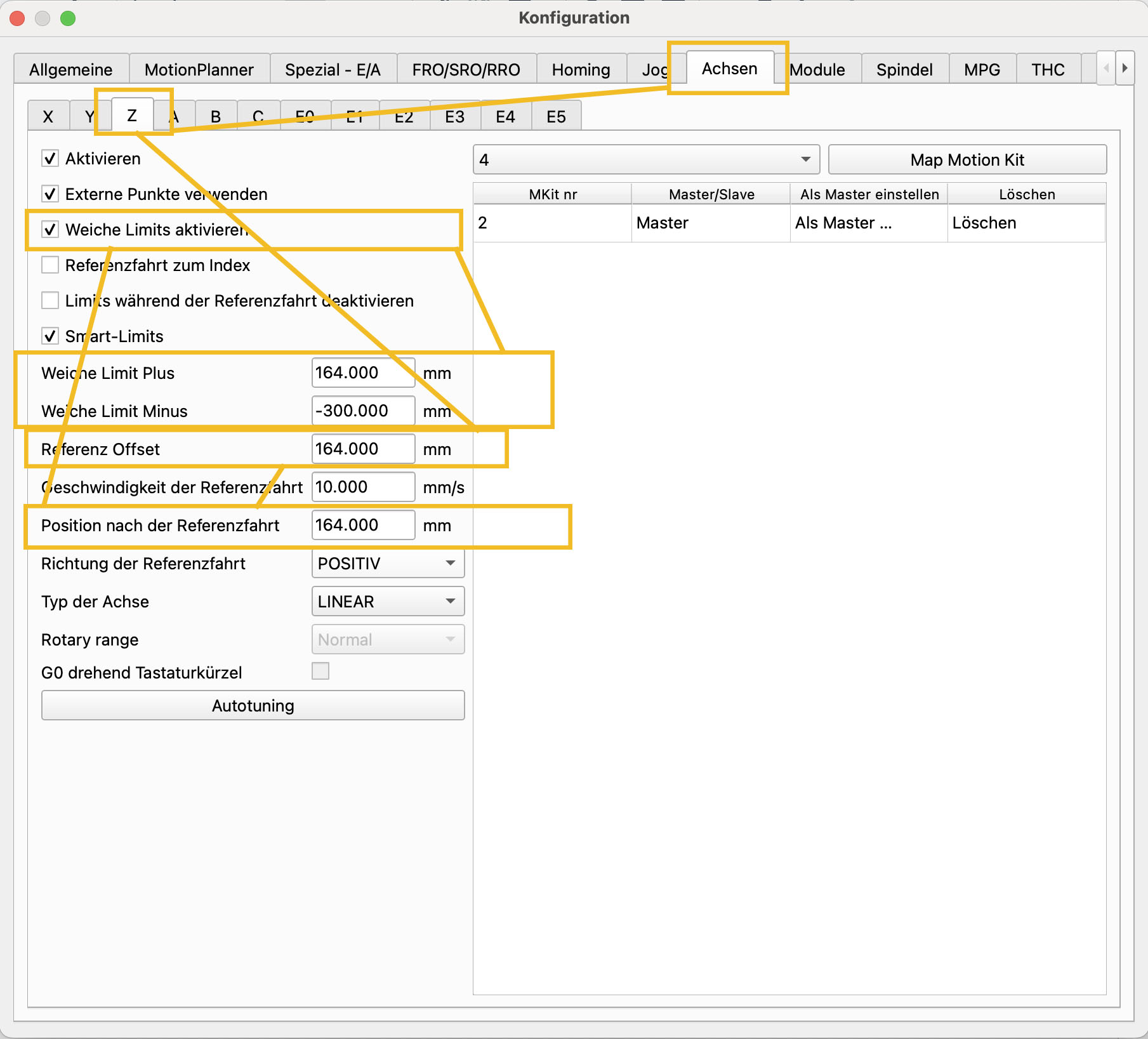 Dann tragen Sie bei Position nach Referenzfahrt auch die 164 mm ein. Die G53 Koordinate wird dann mit 164 mm angezeigt.