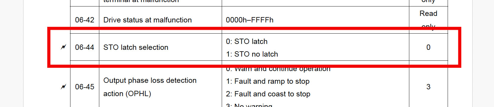 Der 06-44 steht im Auslieferungszustand auf 0. Setzen Sie hier den Parameter 1 um die STO Meldung bei gleichzeitigen Schließen aller Kontakte zu löschen.