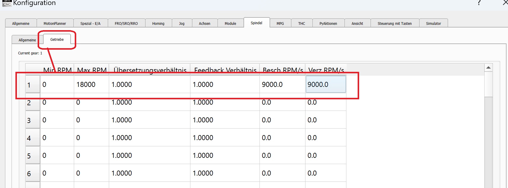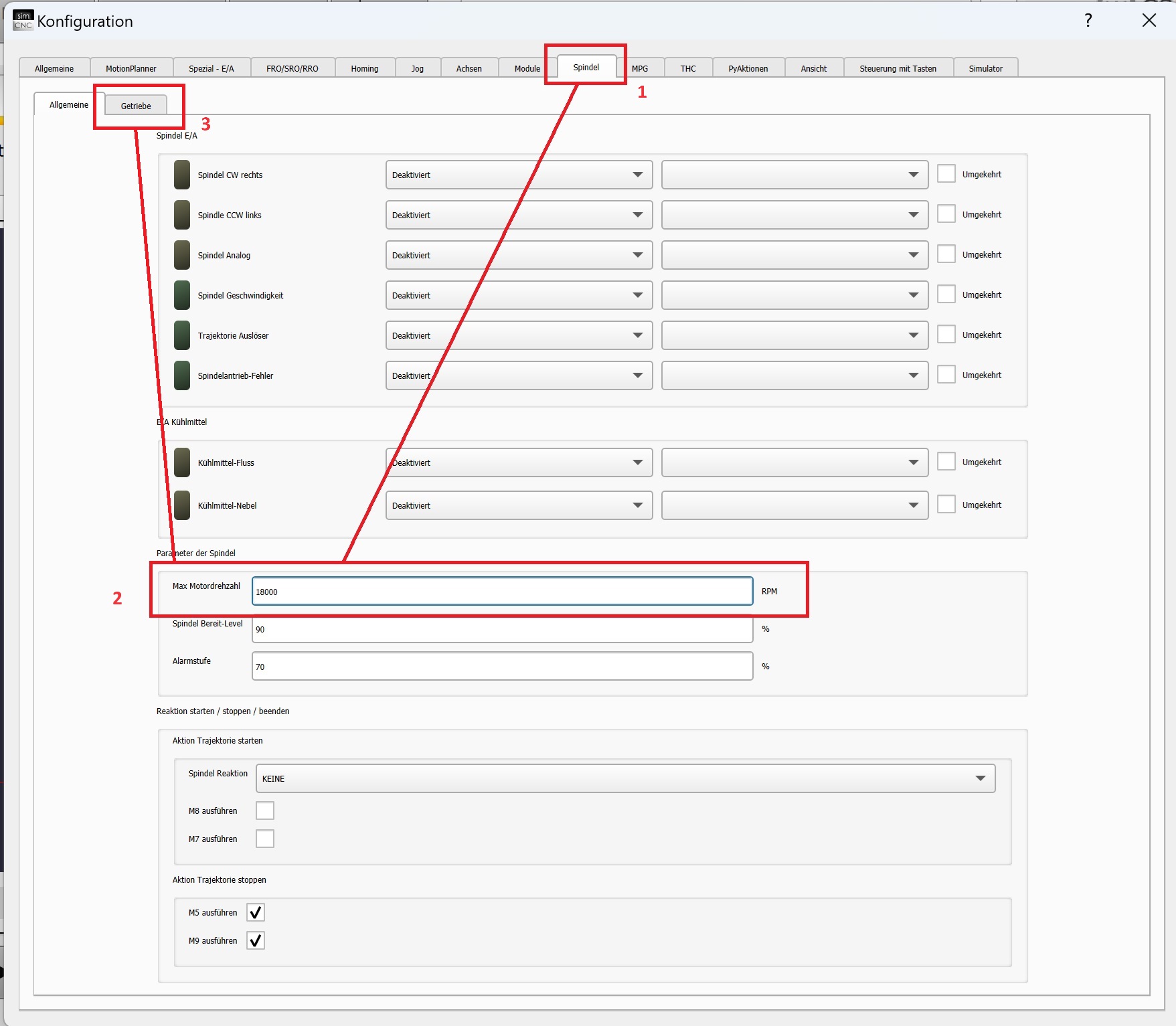 2. Gehen Sie im Fenster Konfiguration auf den Reiter “ Spindel” (1)