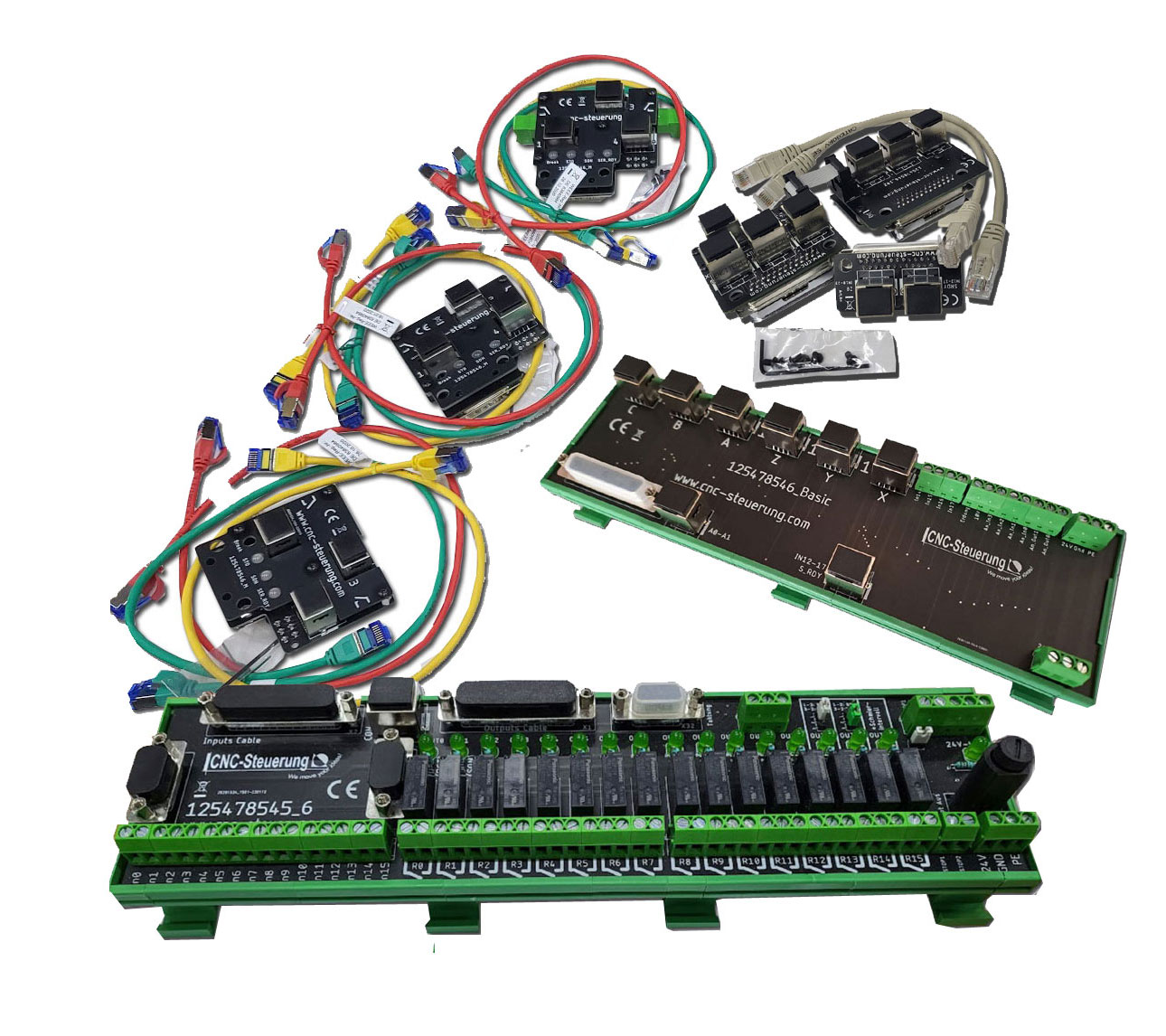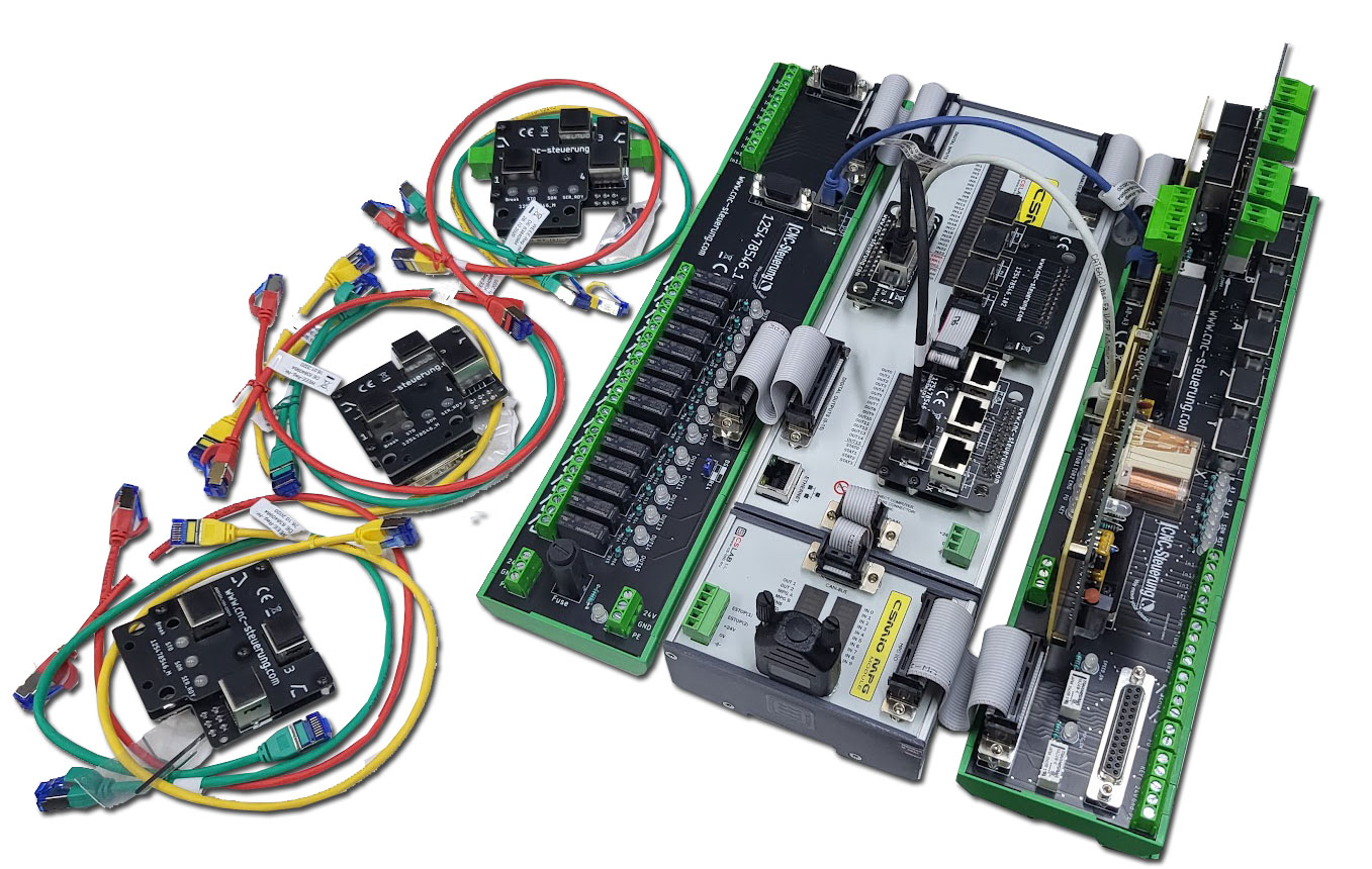 Die Verbindung der Aufsteckplatinen erfolgt mit besonderen Platinen. Diese Platinen bieten wir für unsere CSMIO in digitaler Form und analoger Form an. Also passend zur IP-S und IP-A. Sie als Anwender müssen bei den Servos lediglich Patchkabel einstecken. Die RJ45 Buchsen sind klar beschriftet so das hier keine Fehler entstehen sollten.